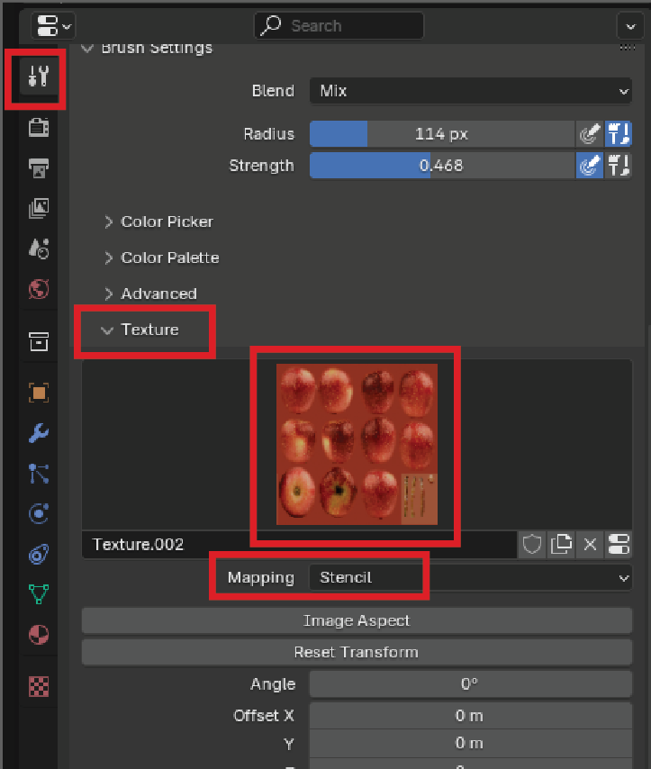 스텐실 할 이미지가 위로 뜨고 브러쉬로 위를 드래그하면 텍스처가 오브젝트에 입혀진다.