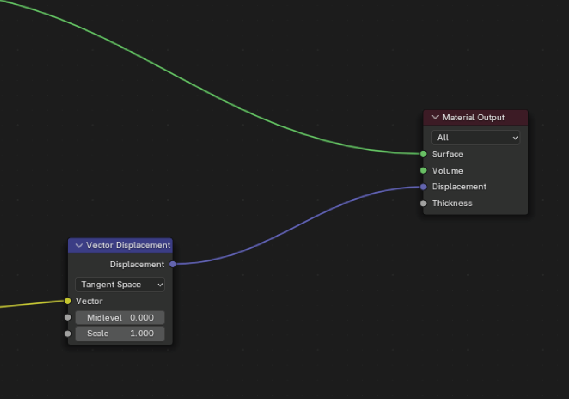 3. displacement를 추가해주고 노말 이미지 파일의 color 와 vector Displacement의 verctor과 연결한다.